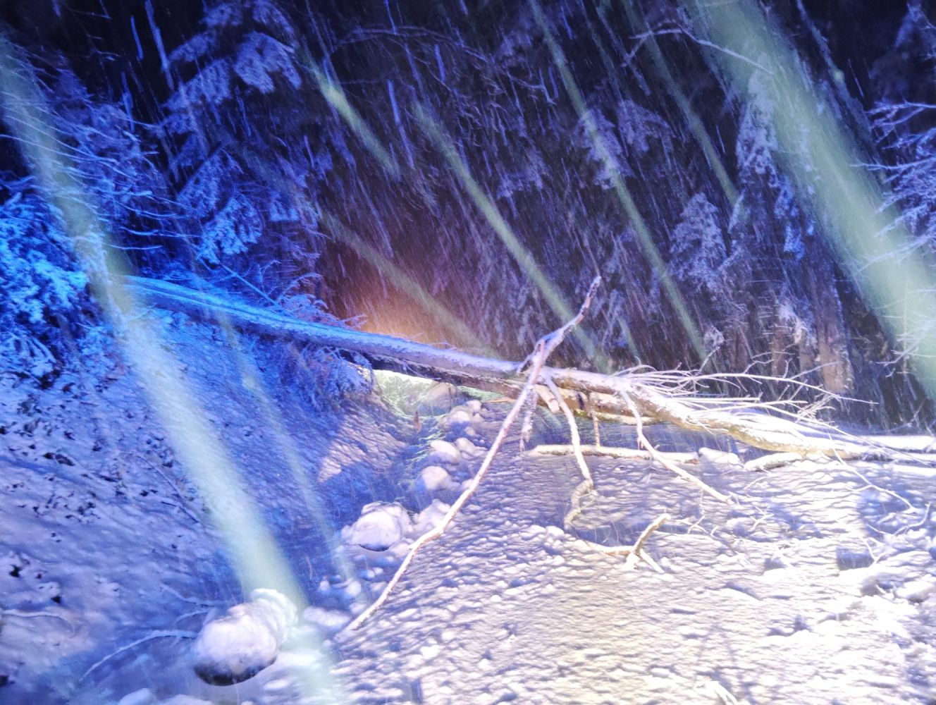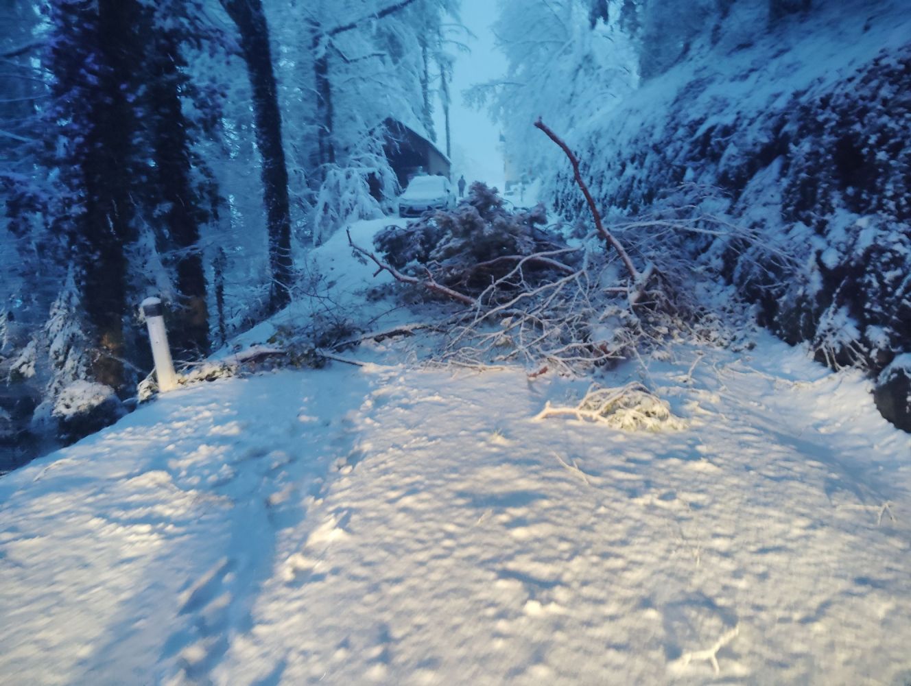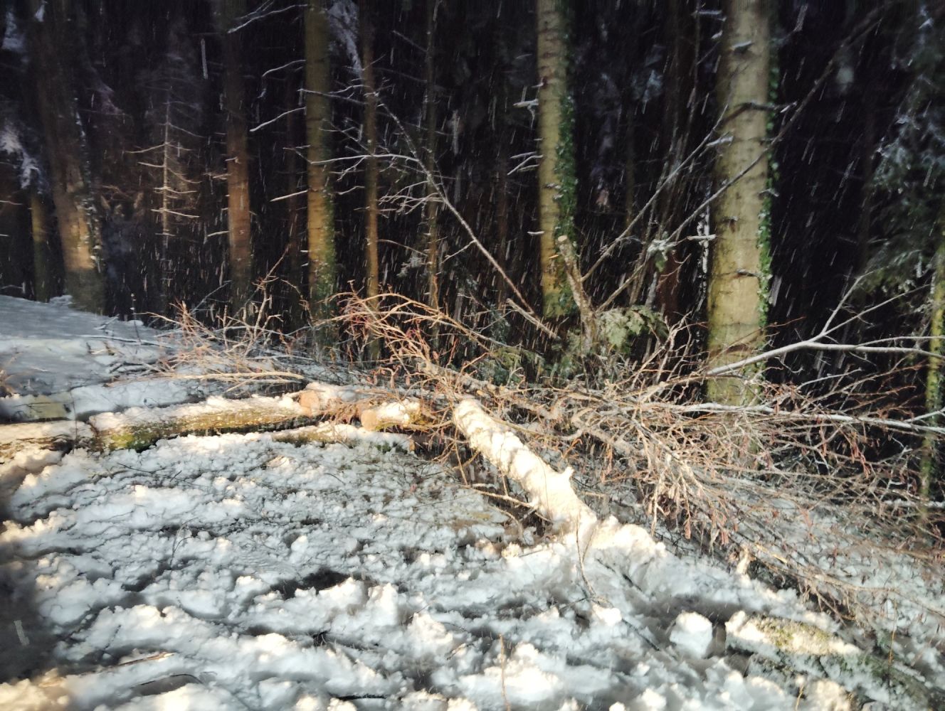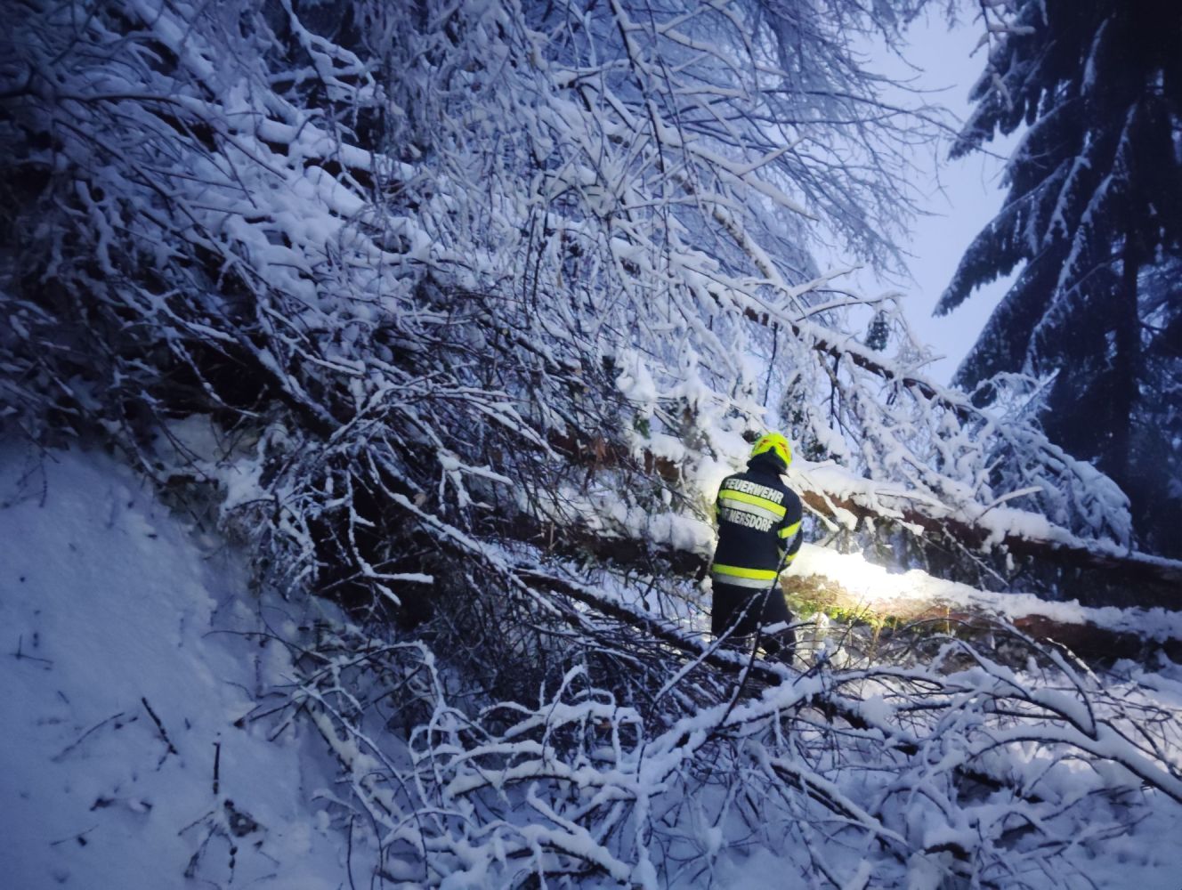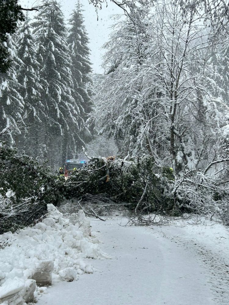 Nach einer kurzen Verschnaufpause erfolgte um 17:30 Uhr erneut eine Alarmierung per Sirene: Durch den starken Schneedruck waren wieder mehrere Bäume auf die Gemeindestraße am Buchenberg gestürzt.
