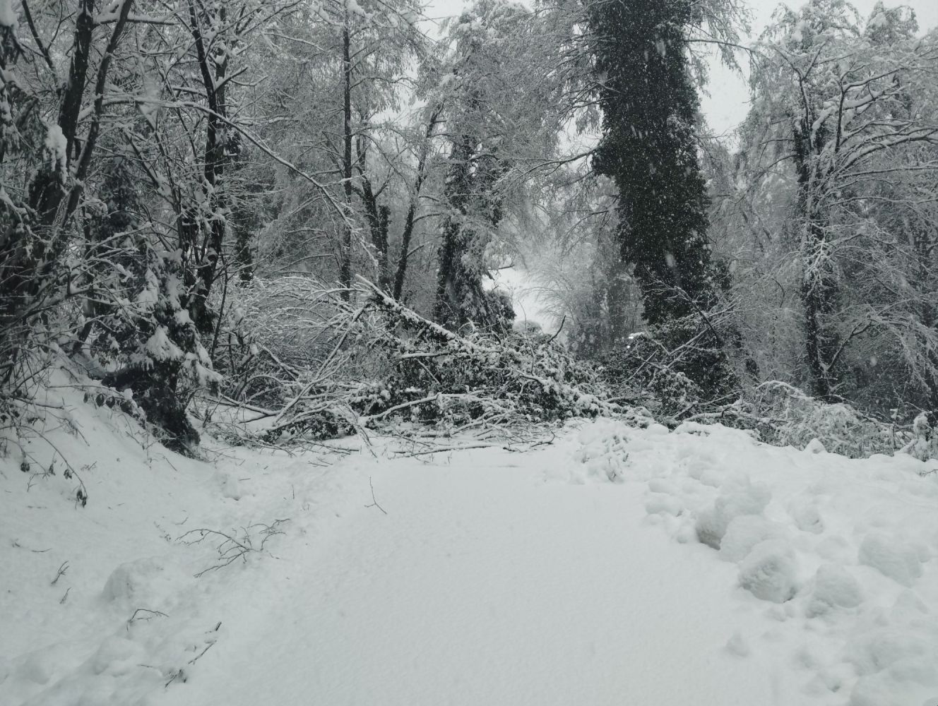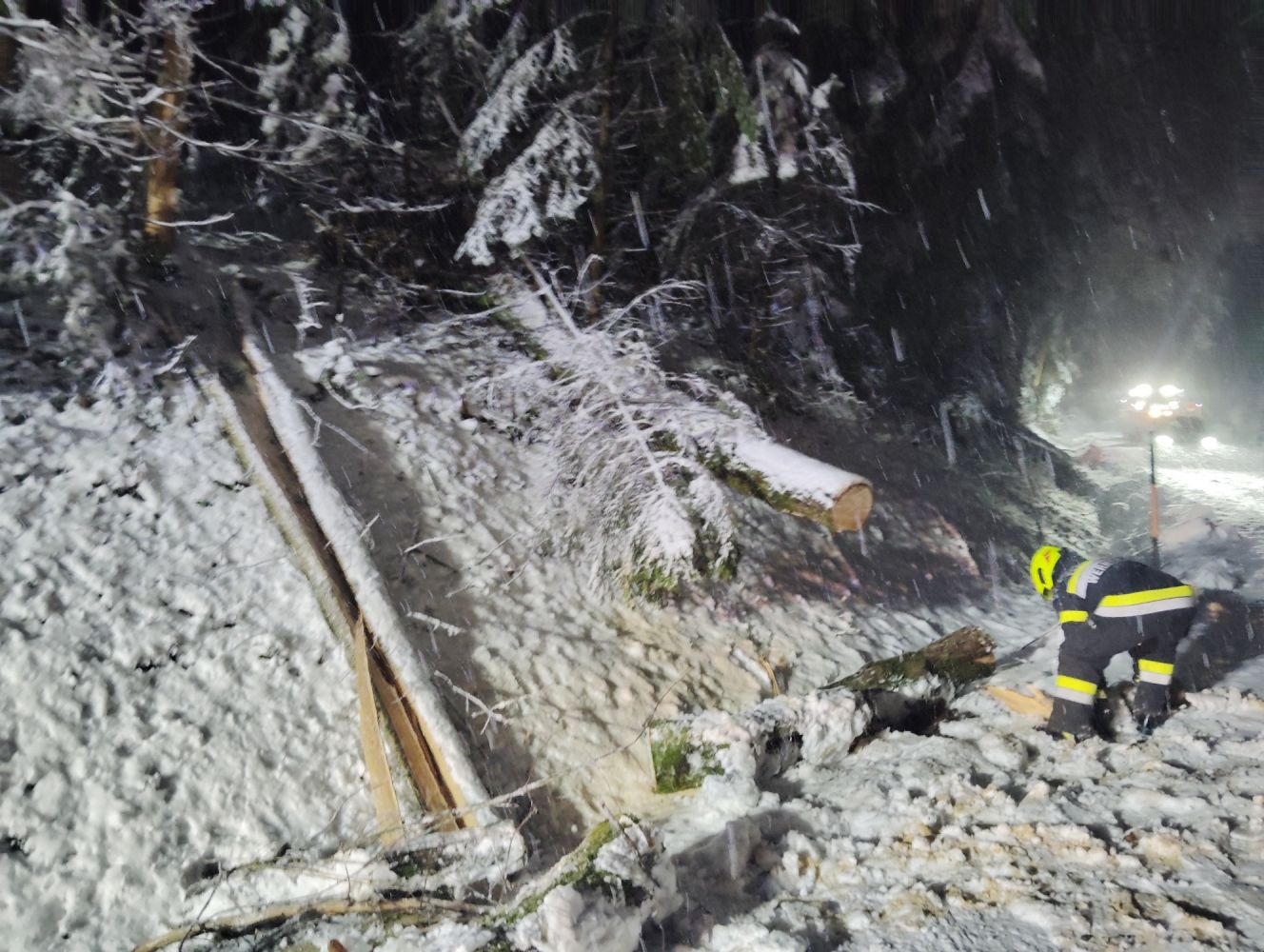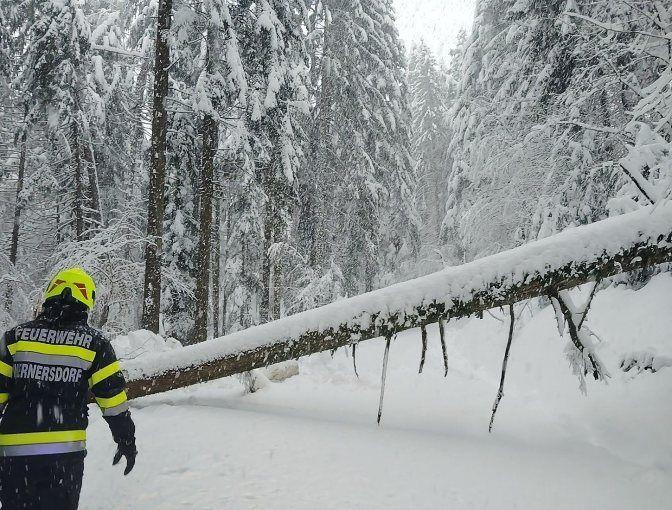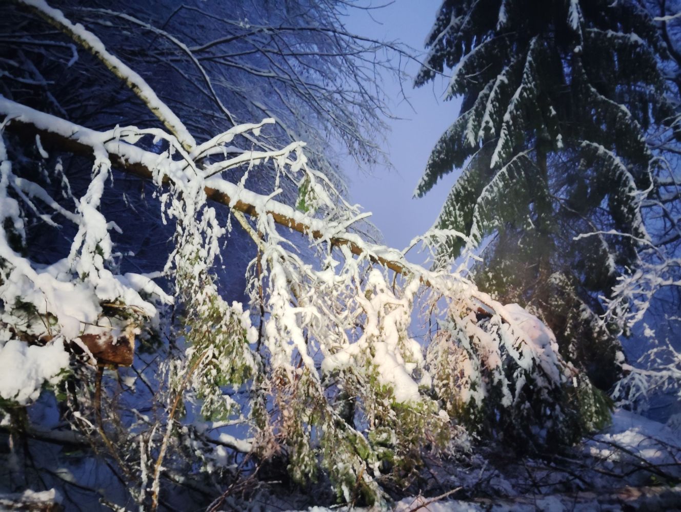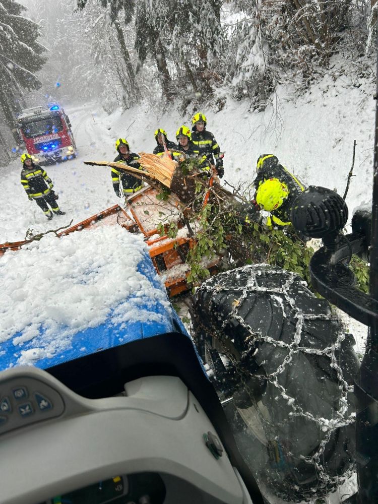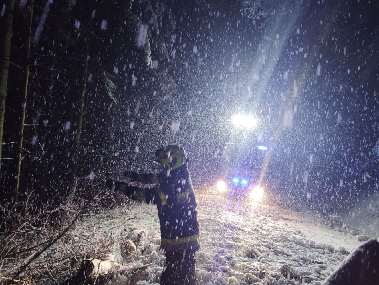 Nach einer kurzen Verschnaufpause erfolgte um 17:30 Uhr erneut eine Alarmierung per Sirene: Durch den starken Schneedruck waren wieder mehrere Bäume auf die Gemeindestraße am Buchenberg gestürzt.